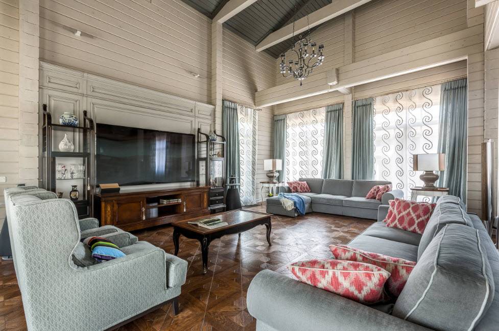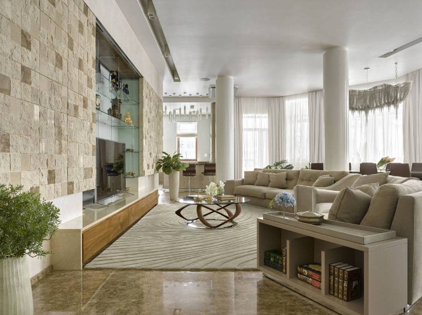 Красивый дизайн интерьера гостиной – это не только качественная отделка пола, стен и потолка, но и грамотная меблировка, текстильное наполнение, освещение и декорирование помещения