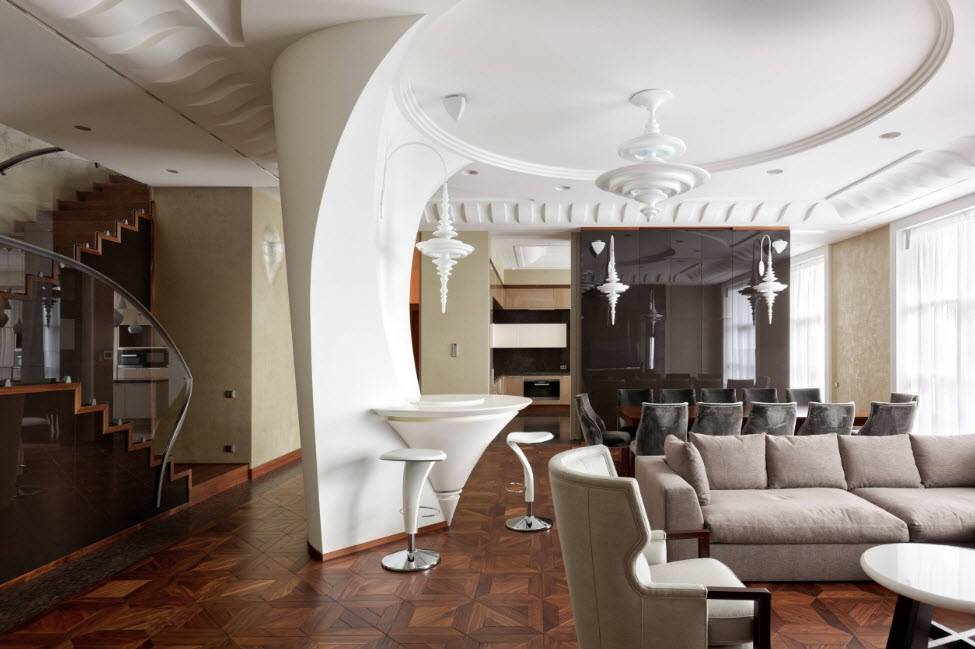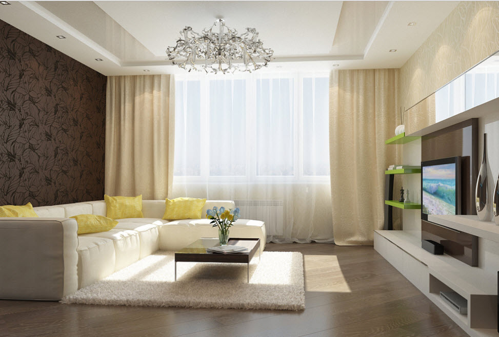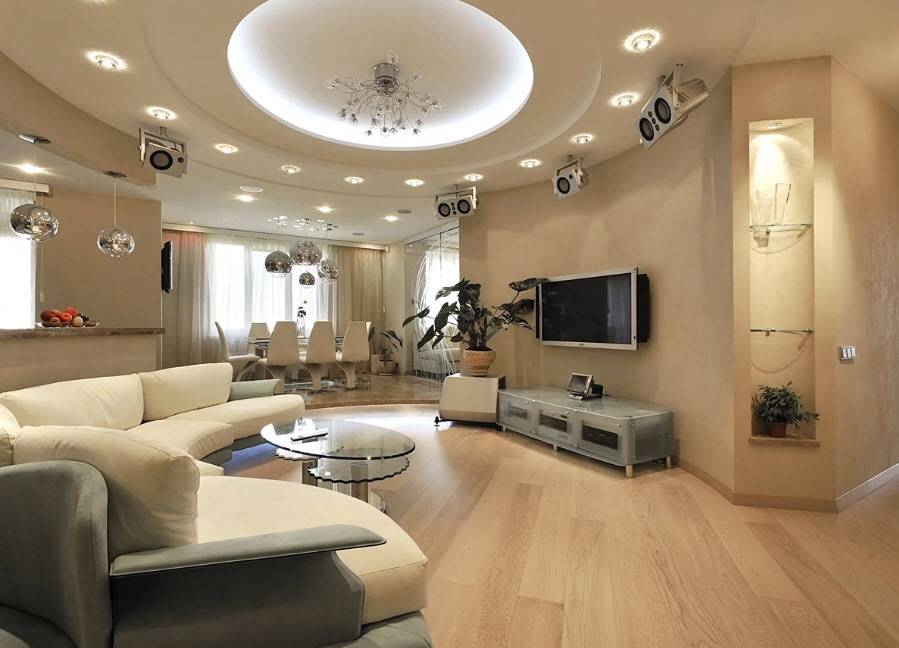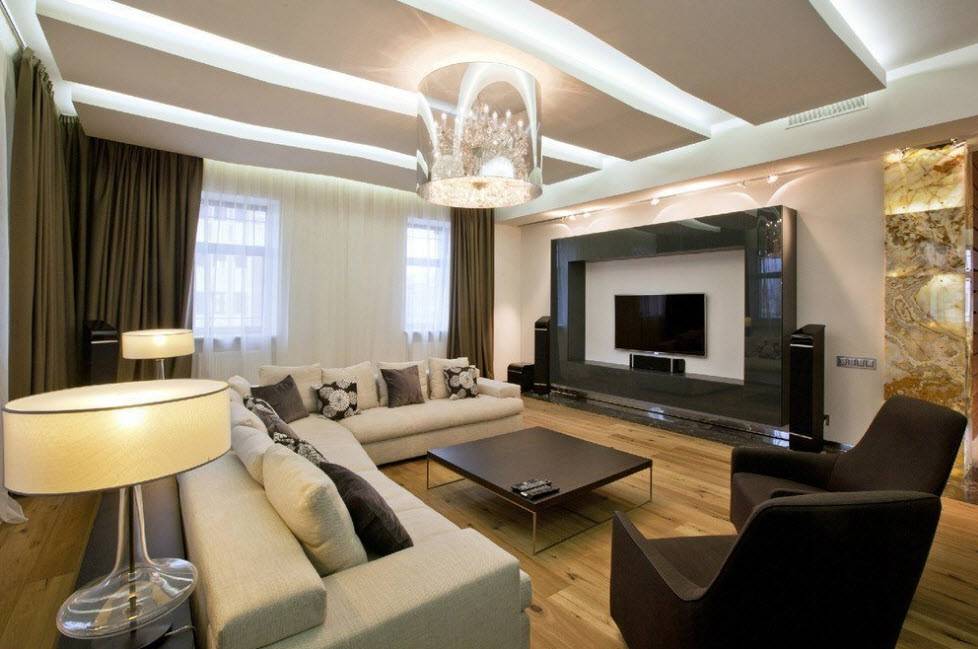 Потолок не выступает яркой деталью, но формирует геометрию, объем комнаты: увеличивает или, наоборот, уменьшает ее. Эффекты, которые способны придать осветительные приборы, зонируют зал, создают настроение. Под потолком можно скрыть трубы, провода, гардины.