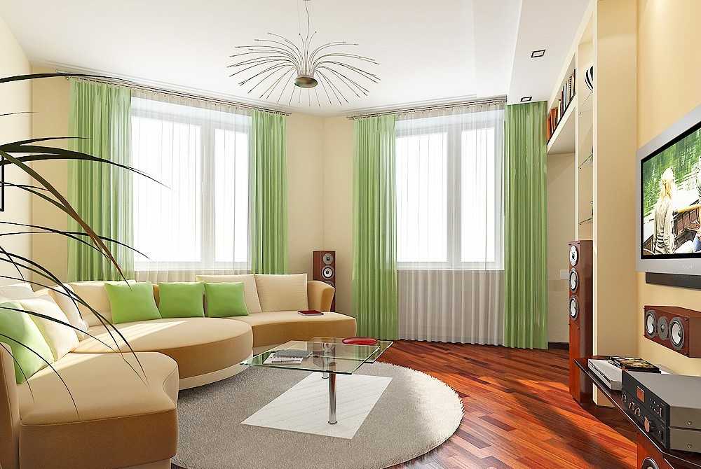 Оформление зала с двумя окнами кажется сложнее лишь на первый взгляд. Грамотно расставив мебель и подобрав цвета при оформлении интерьера, можно создать красивую и оригинальную композицию.