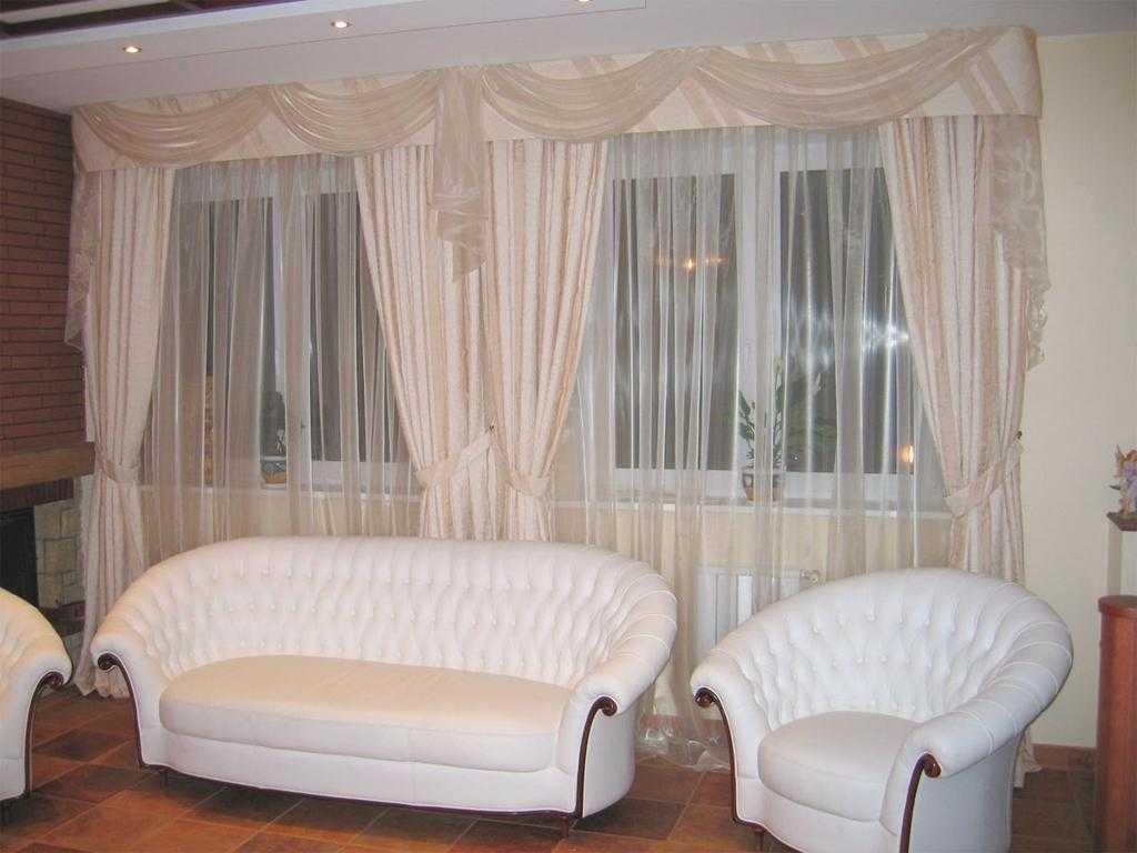 | Большое | Длинные и широкие, со складками; допустимы тяжелые элементы | Темные или яркие цвета в комбинации с прозрачными занавесками |