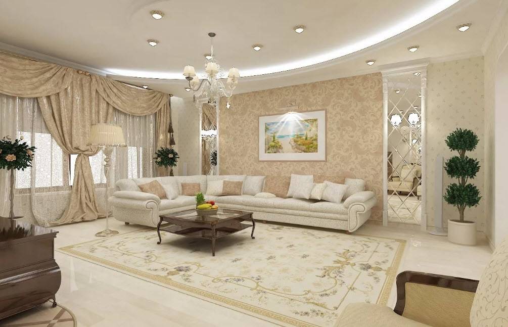 В классическом дизайне используются только дорогие, качественные и натуральные материалы. Основной акцент в гостиных делается на потолке, который принято окрашивать в ярко белый цвет, позволяющий зрительно увеличить высоту стен. Такие потолочные покрытия представляют собой настоящие произведения искусства. Они декорируется лепниной, пилястрами, фризами, розетками или расписывается художественной росписью.