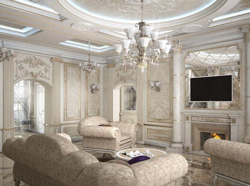 Создание однотонного основания в пастельных тонах. Для отделки используют колоны и лепнину, декоративную штукатурку. Дополнить изысканную атмосферу поможет настоящий дровяной камин.