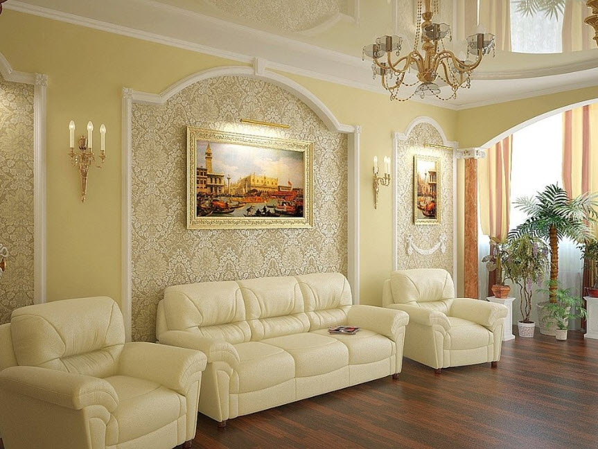 В классическом стиле стены дополнительно украшаются рельефными молдингами; пилястрами; фризами, а также расположенными в симметричном порядке картинами, имеющими одинаковые рамы. Если позволяет площадь комнаты, поверхности стен можно декорировать античными колоннами или полуколоннами.
