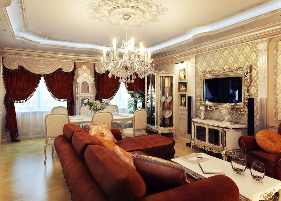 Помещение в котором решено реализовать дизайн интерьера в классическом стиле, должно обладать не меньшими достоинствами. Большие окна, высокие потолки для хрустальной люстры, да и просторная комната — это обязательное требование.