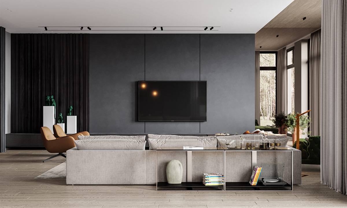 Серая гостиная в стиле минимализма — это прежде всего характерный пол. В этом случае вы можете выбрать плитку или уже упомянутый архитектурный бетон.