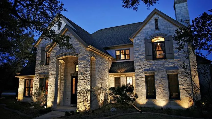 - Самый выигрышный в декоративном смысле прием — подсветка фасада снизу вверх.