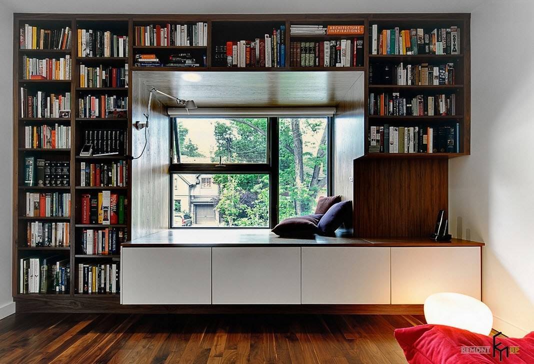 Этот встроенный уголок для чтения в гостиной, экономит немалое количество пространства. Удобное и практичное расположение рабочих поверхностей, позволяет использовать широкий подоконник не только в качестве поверхности хранения, но и как письменный стол и место для сидения.