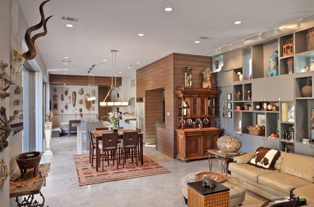 Эклектика, как-будто специально создана для любителей путешествовать, привозить сувениры и собирать коллекции. Открытые стеллажи и полки позволяют предоставить на общее обозрение милые сердцу вещицы. Собранные в одном интерьере антикварные предметы мебели, современные светильники и лампы, изделия ручной работы и новинки технологического прогресса, создали удивительную и неповторимую атмосферу гостиной.