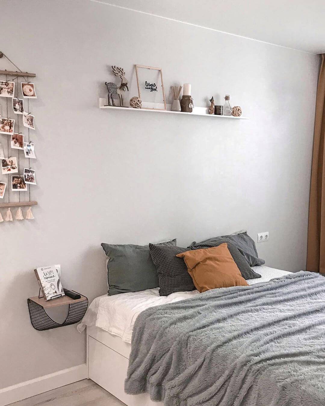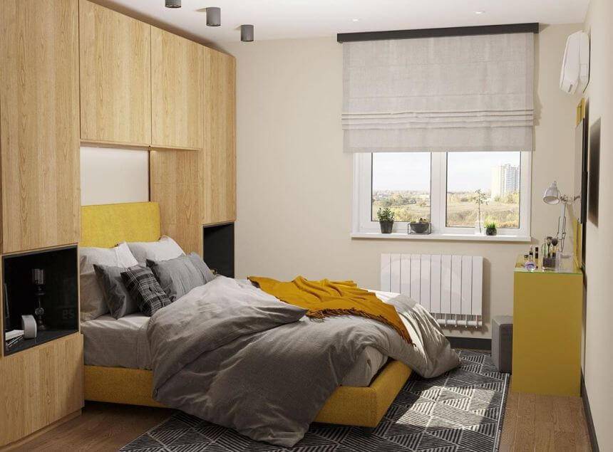 Оптимальный размер кровати для комнаты 14 кв м — 180 х 200 см. В длинной узкой комнате кровать лучше сдвинуть к стене. У изголовья можно повесить полки или сделать П-образную систему хранения с множеством полок.