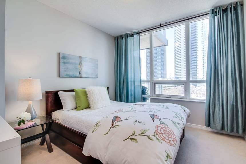 Расстановка мебели начинается с определения места для кровати – центрального предмета интерьера в спальне. Обычно кровать устанавливают изголовьем к стене. Для двуспальной модели оставляют проходы с двух сторон не меньше 60 см.