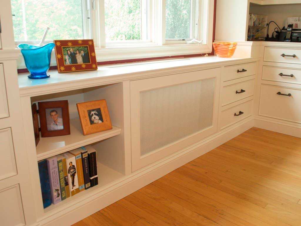 - Навесные полки или стеллажи, размещаемые с двух сторон от окна.
