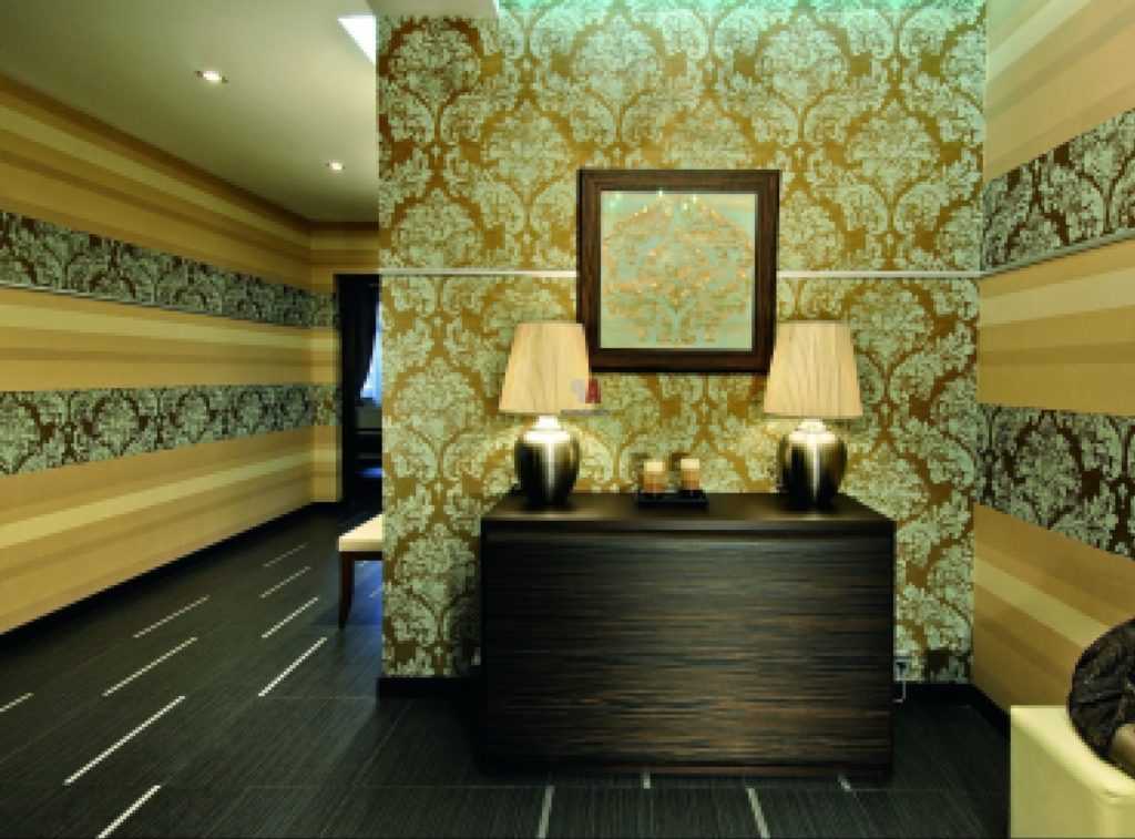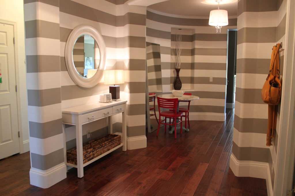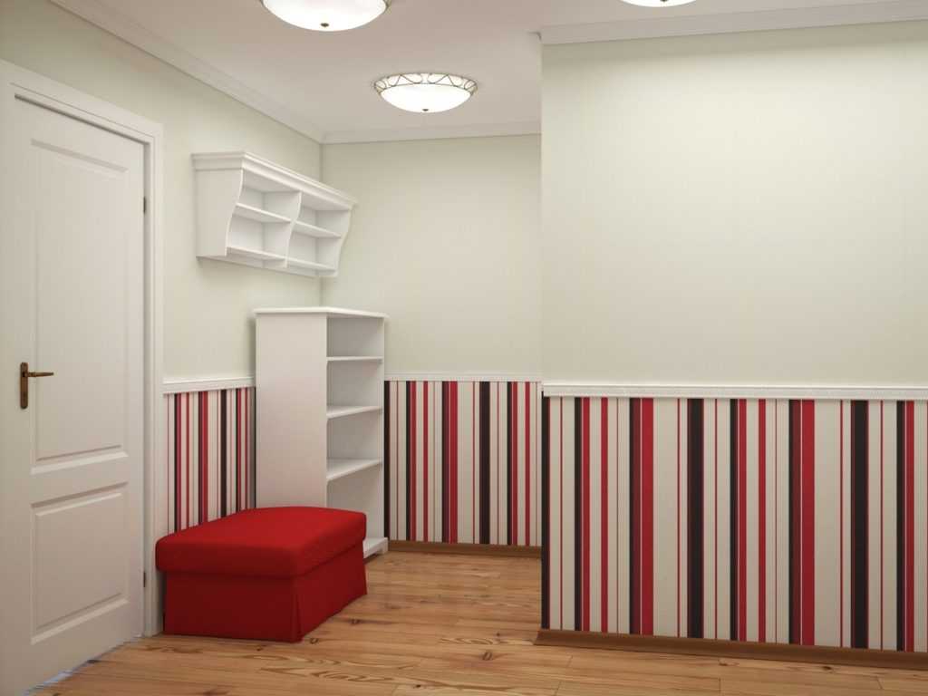Все они разнообразят интерьер прихожей. Полоска идеально сочетается с обоями, имитирующими кожу, дерево, камень, текстиль. Она уместна при двойном оформлении стен: верх или низ делаются однотонным, другая часть – полосатыми шпалерами. Бордюр тоже делают полосатым.