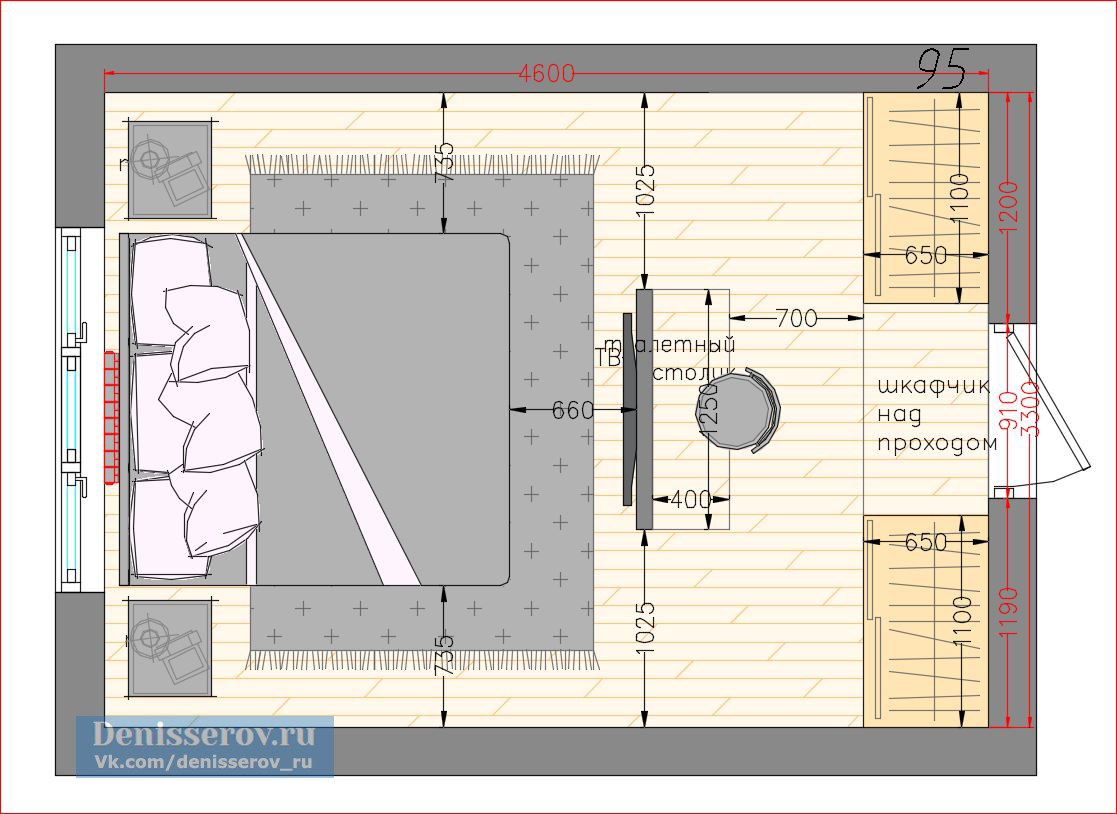 Второй вариант. Здесь кровать помещена изголовьем к стене слева. С двух сторон от изголовья так же стоят прикроватные тумбочки. Справа от окна поставлен туалетный столик и тумба с телевизором. С двух сторон от входа размещены шкафы-купе. Простенок над входом так же задействован — использован под шкафчик.