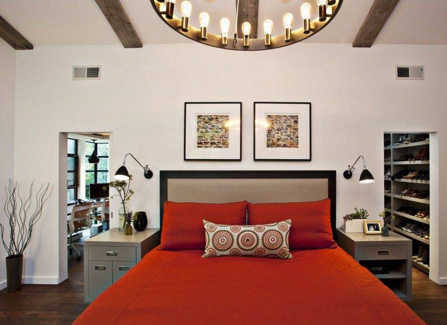 Рабочий кабинет в спальне имеет смысл разместить в случае, если площадь дома или квартиры весьма ограничена. Наполнение помещения трансформируемой мебелью позволит эффективно использовать пространство не только для ночного отдыха, но и для дневной работы.