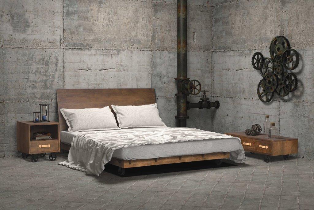 Индастриал – достаточно распространенный стиль, который широко применяется при отделке спален. Он предполагает использование мрачных и монохромных оттенков. Спальня должна быть выдержана в коричневом или сером цвете. Также допускается использование цвета хаки.
