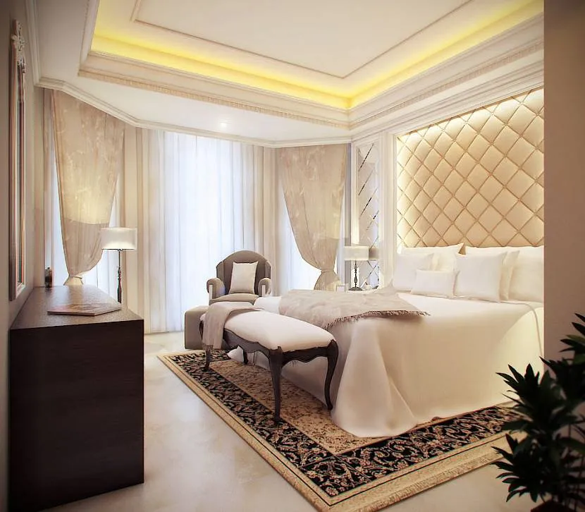 В этой красивой спальне в бежевых тонах установлена мебель таких же бежевых оттенков, которая прекрасно вписывается в окружающее белое пространство. Использование этих смелых цветов придает пространству глубину и интересную перспективу. Добавьте дополняющих нейтральных или насыщенных оттенков, чтобы придать комнате более современный вид, оставляя общий дизайн в классическом стиле.