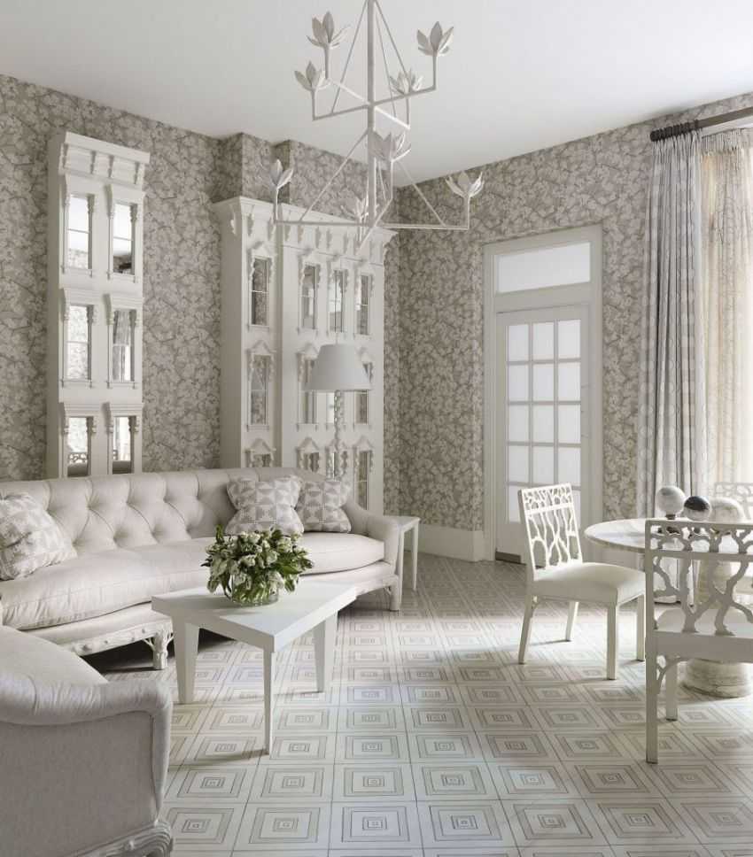 В белой гостиной надо использовать подушки насыщенных тонов и цветы, которые станут отличными изюминками при оформлении комнаты.