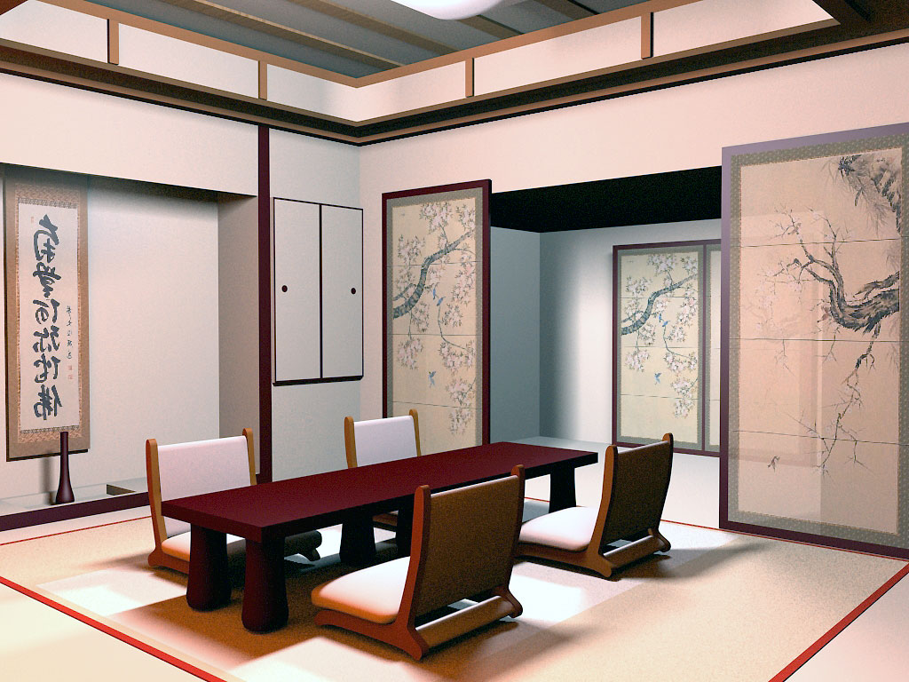 В качестве декоративных элементов могут быть использованы разнообразные статуэтки, веера. Стены и картины украшают рисунки с изображением растений, птиц, китайских иероглифов.