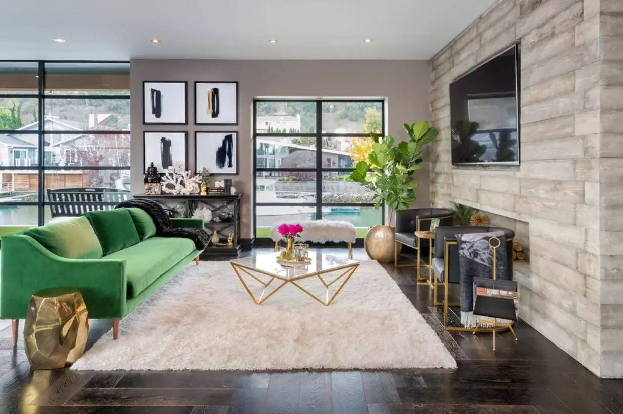 По центру гостиной должен лежать ковер с крупным, роскошным рисунком или однотонный. В этом случае все остальные предметы интерьера следует размещать по его периметру. Один из главных элементов — мягкий диван. От угловых моделей стоит отказаться, отдав предпочтение большому дивану с однотонной обивкой, крупными подушками.