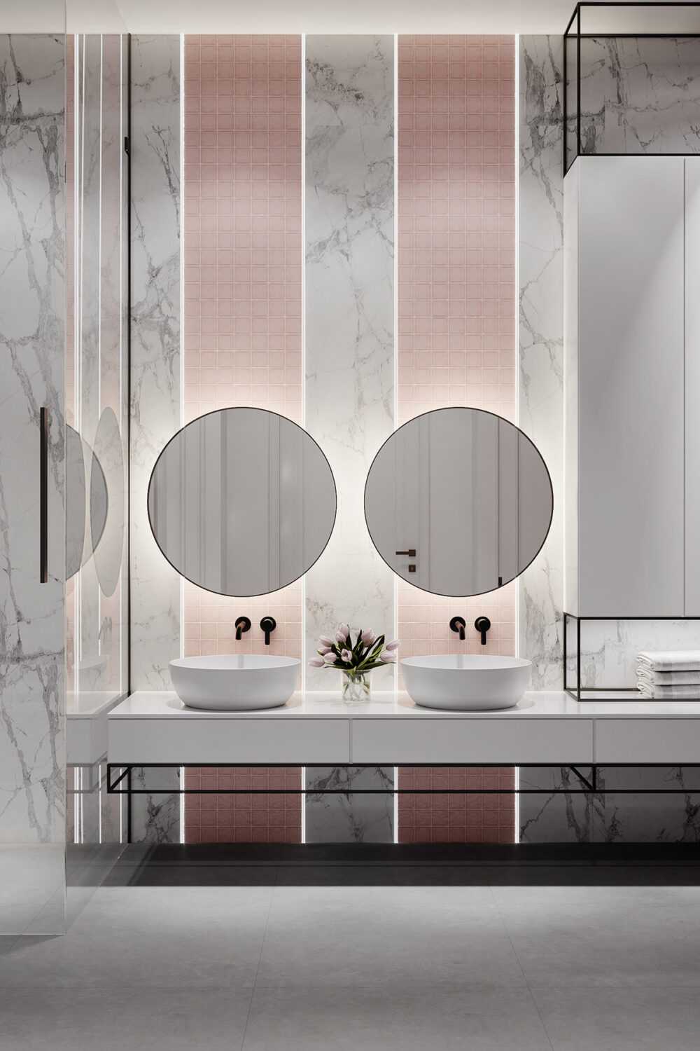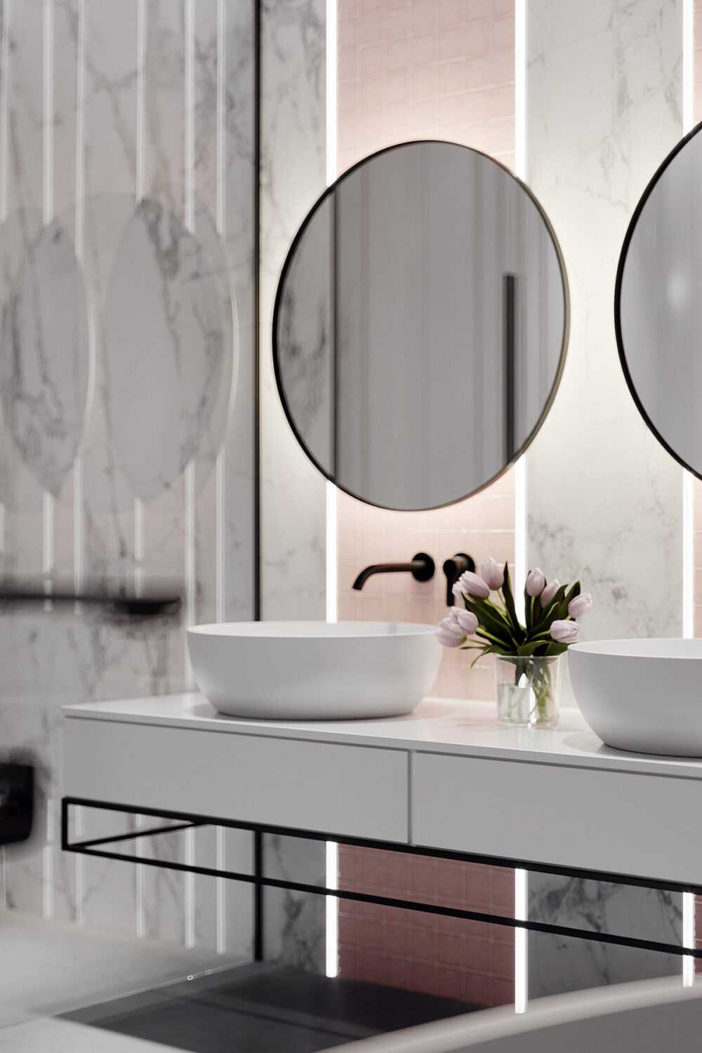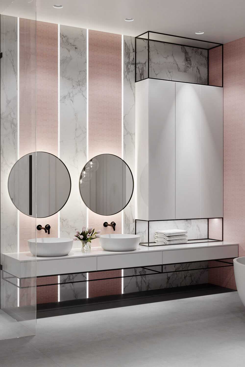 Тронные залы и гостиные, где проходили балы, славились высокими потолками. Иначе как же установить огромные окна, повесить роскошные люстры и где поместятся все декоративные элементы? В современных квартирах потолок в десять метров и не нужен, но как дань прошлому потолок в ванной комнате в стиле неоклассика должен быть высоким. Или хотя бы попробуйте сделать его визуально выше с помощью глянцевых поверхностей, зеркал и освещения.