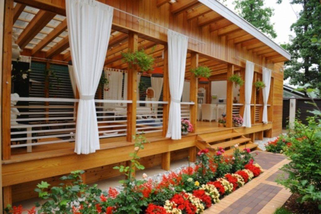 На участке есть гостевой домик, выстроенный в деревенском стиле, его Ирина построила для своей мамы. Рядом устроен небольшой импровизированный огород с помидорами и огурцами.