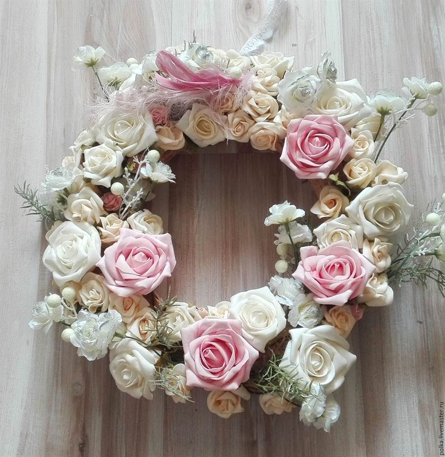 Для интерьерного венка можно сплести каркас самостоятельно из свежих прутьев ивы, другого подходящего растения или создать из проволоки, обмотанной тканью, лентами или бумагой, а также окрашенной. Каркас исполняется в круговой форме, квадратной или ромбовидной, либо в однополосной прямой или изогнутой икебаны.