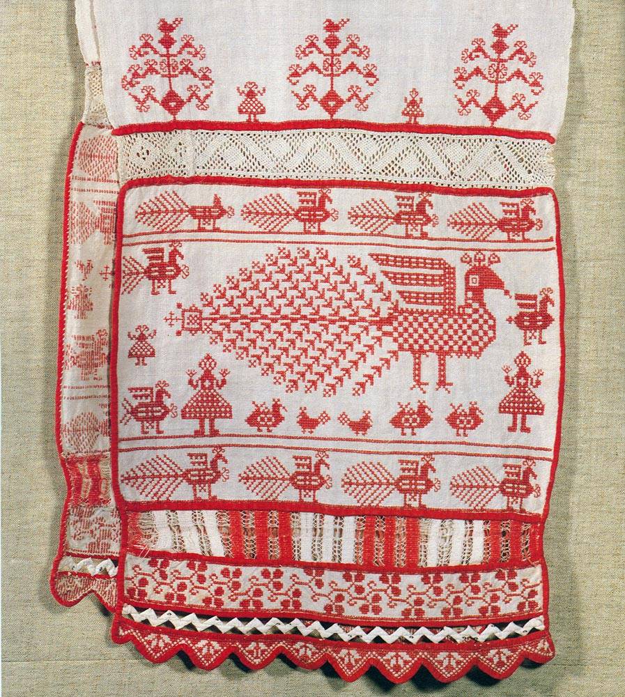 В музеях сейчас можно увидеть много образцов народной вышивки. Конечно, лучше всего сохранились работы 19 века. Прочные традиции имела народная вышивка, в отличие от городской. Городская была больше подвержена влиянию моды, что не распространялось на народную. В деревнях девочки приготавливали себе приданное уже к 13-15 годам. Этим приданным были вышитые подарки, скатерти, полотенца, предметы одежды и так далее. Незадолго до свадьбы, чтобы оценить уровень мастерства девушки, устраивалась выставка. Затем уже на свадьбе все то, что девушка вышила своими руками, она дарила родственникам жениха.