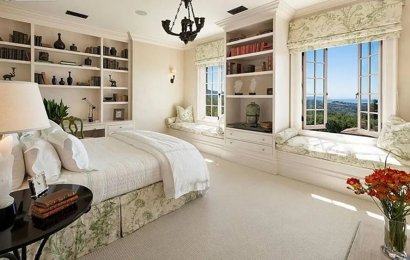 В спальне следует на окна вешать не только итальянские шторы, а комбинировать их с рулонными занавесками. Ведь здесь важен не только дизайн штор. Комнату необходимо затемнять и защищать от взглядов любопытных людей с улицы. Однако, цветовая палитра штор при этом должна оставаться светлой.