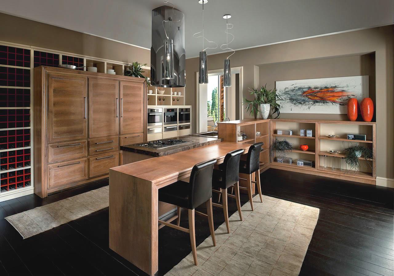 Важно отметить, что в интерьере кухни приветствуется тонировка древесной породы. Вы будете подбирать гарнитур и шкафы в самых неожиданных фактурах дерева: монохромную, двухцветную, мореную, выбеленную. Кухонный гарнитур в итальянском стиле всегда массивный