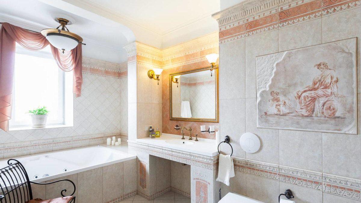 В качестве доминанты на картине интерьера ванной комнаты может выступить раритетное зеркало с массивным позолоченным багетом или панно из керамической мозаики, изображающее древнюю гавань или виноградную долину.