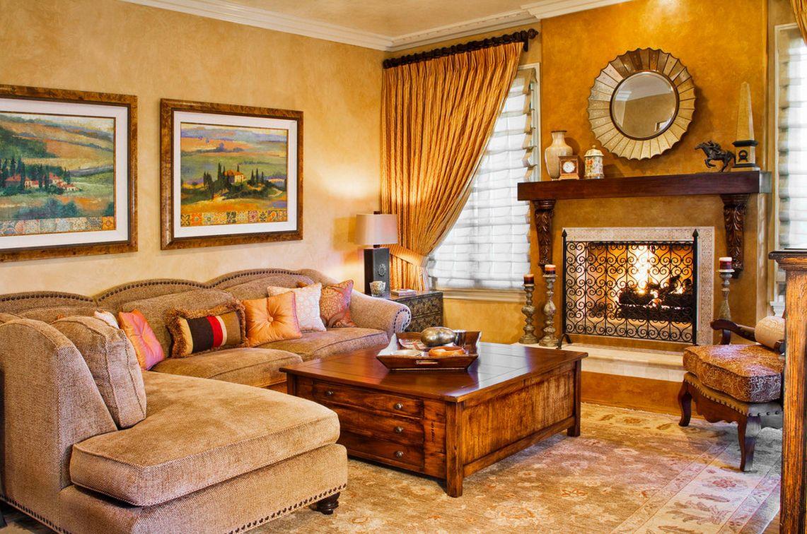 Для гостиной подходят как классическая разновидность с её пышностью и роскошью, так и слегка брутальные (тосканский, деревенский). Пол в гостиной можно отделать керамикой или деревом, стены – покрасить или оштукатурить.