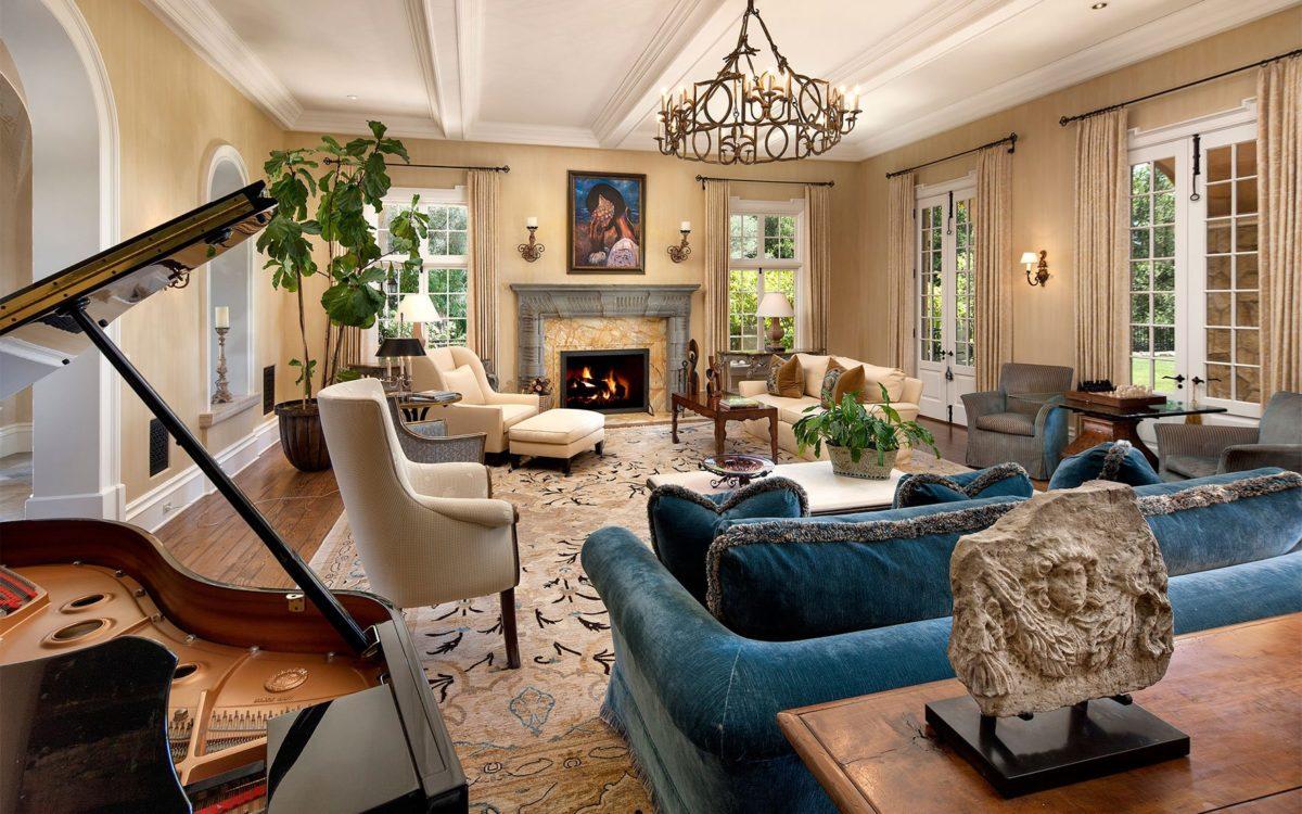 Электрический камин с каменной или деревянной дверцей, классический набор обивки и красивая многоярусная люстра добавят интерьеру атмосферности.