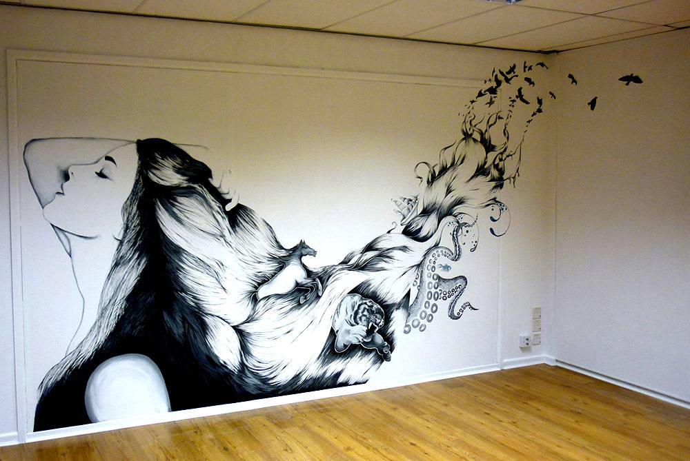 Благодаря широким возможностям колеровки такая роспись стен в интерьере может выглядеть абсолютно по-разному: от пастельных пейзажей, напоминающих фрески, до кислотных граффити.