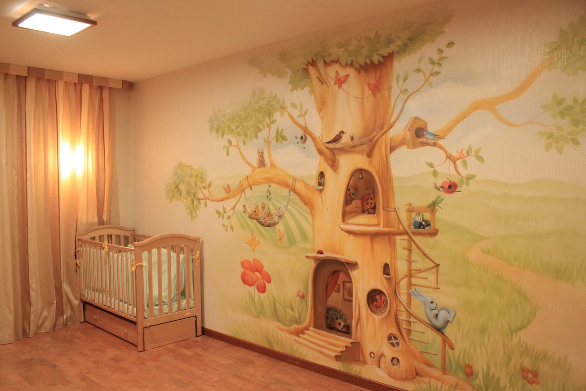Расписанные стены в детской непременно порадуют вашего ребенка. В такой комнате им будет казаться, что они попали в сказку. Принцессы станут подружками девочек, пираты и супергерои – друзьями мальчиков. Рисунки можно выполнить в любой технике – от нанесения краски с помощью трафаретов до использования художественной росписи. Поэтому с этой работой вполне можно справиться самостоятельно даже при отсутствии профессиональных навыков. Не обязательно использовать белый фон. Даже лучше, если стена будет окрашена в нежные оттенки голубого, розового, зеленого или желтого цвета. Можно ограничиться одним элементом, или разрисовать всю стену. Участие в процессе самого ребенка превращает его в соавтора. Даже самый минимальный вклад владельца комнаты дает полное право гордиться собственным творчеством и ценить выполненную работу. Не стоит сдерживать фантазию детей – ее влияние поможет сделать комнату уникальной.
