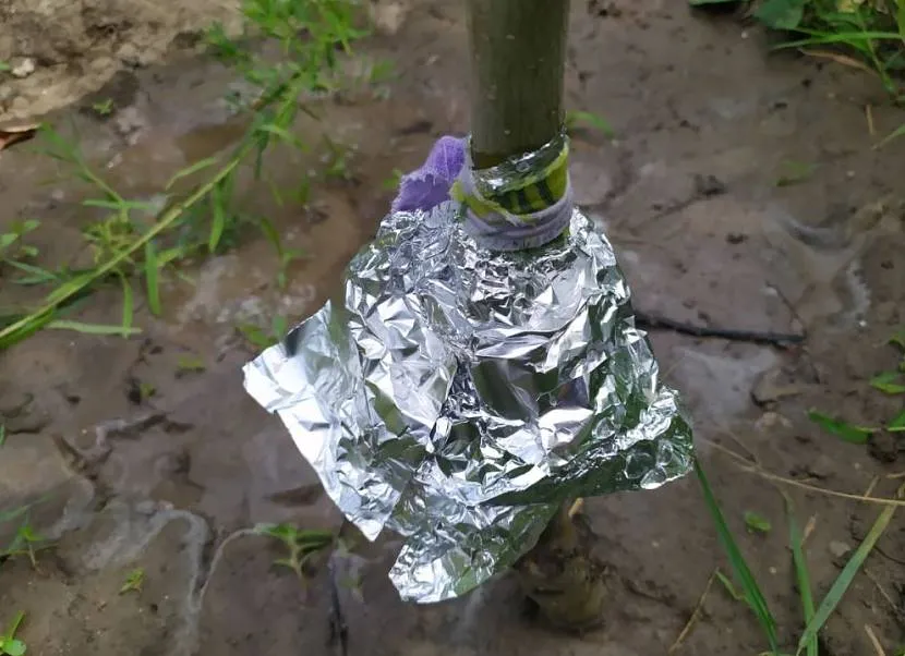 Сделайте вокруг ствола ободок из картона или обычной фольги. Главное, чтобы острые края материала не были примяты, а лучше всего – создать смотрящую вниз воронку. Муравьи не обладают чрезмерной гибкостью, поэтому перебраться на другую сторону не смогут. Зазор между стволом и «хомутом» замажьте пластилином, глиной или оным составом. Главное, чтобы он полностью преграждал путь наверх.