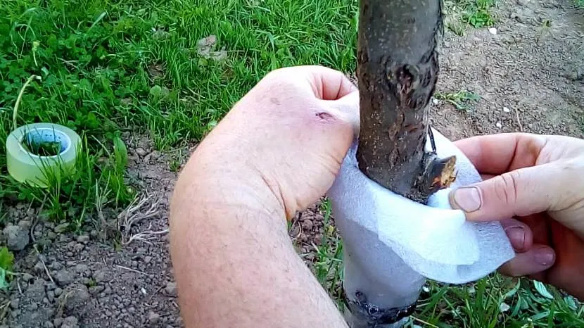 - Взять полиэтилен или плотную тряпку и обернуть вокруг ствола. Ширина покрытия 20-25 см.