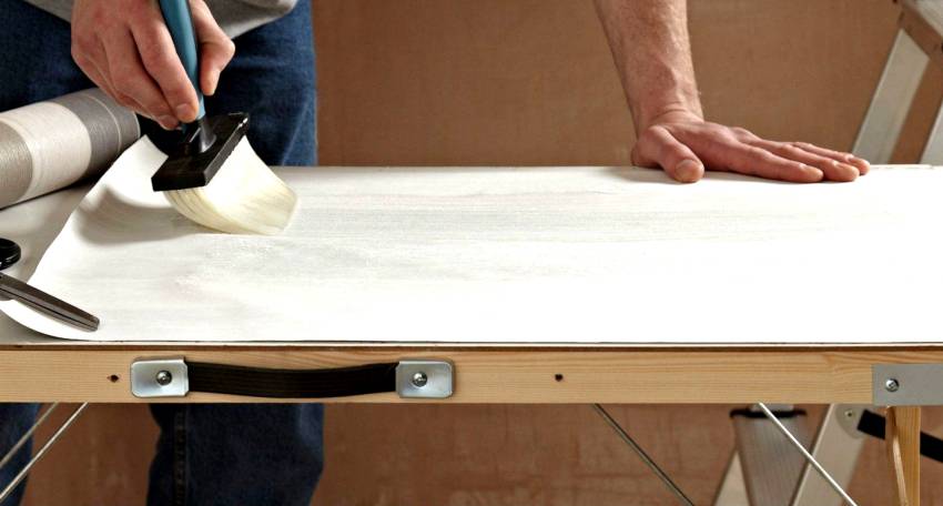Расстилают полотно и валиком наносят клей, стекающие излишки по краям потом можно удалить тряпкой. Одновременно готовить к оклеиванию несколько полотнищ не рекомендуется, иначе пока приклеивают одно, другое высохнет.