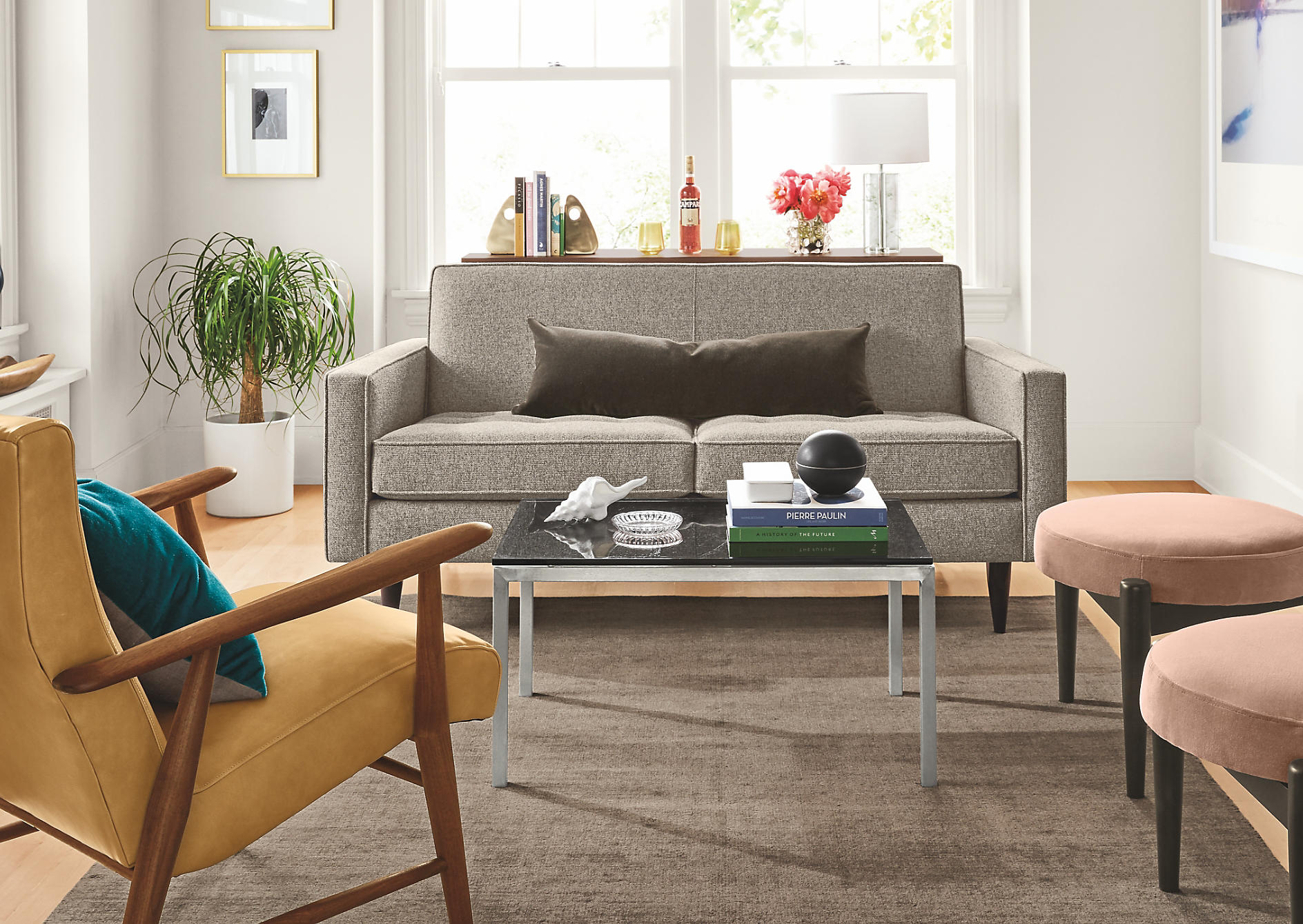 - Цвет + нейтралитет. Разбавить нейтральный интерьер и поставить правильный акцент можно с помощью яркого цвета дивана. Необязательно выбирать самые насыщенные оттенки, достаточно найти ткань на 2-3 тона темнее стен.