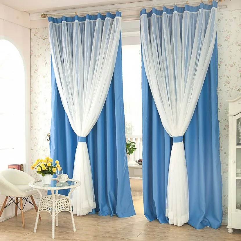 От нежно голубого и до насыщенного синего. Само сочетание сине-голубых гардин и мятных стен оптимально подойдет для детской комнаты – смотрится ярко и живо, несет в себе нежную утонченность. Если вы выбираете двойные полотна – верхний слой может быть нежно голубого оттенка, а нижний – более насыщенного мятного. Такое сочетание внесет нотку свежести в любой интерьер и позволит визуально расширить маленькое по площади пространство