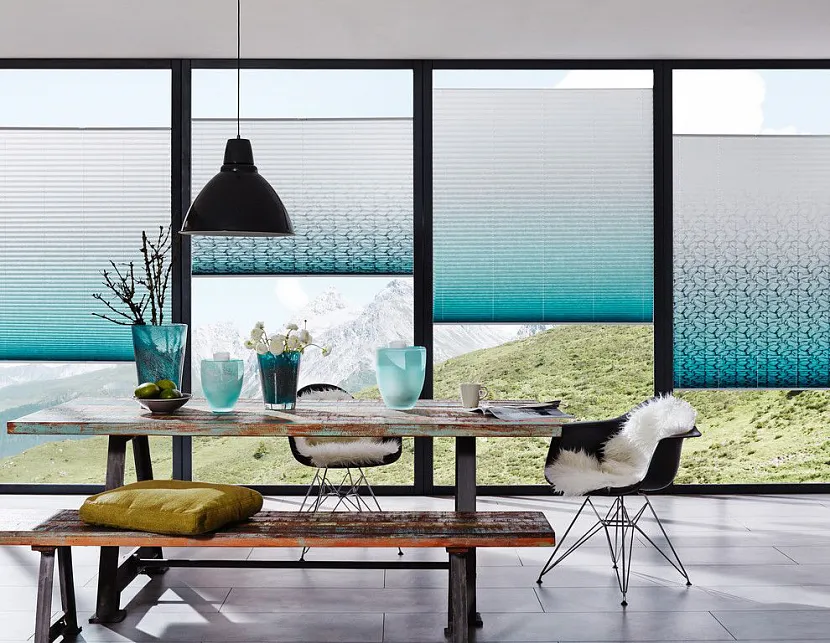 Модными стали шторы-плиссе. Их преимущество в том, что они подходят для всех типов окон, в том числе нестандартных, мансардных. Удобно то, что раздвигаются по вертикали снизу и сверху.