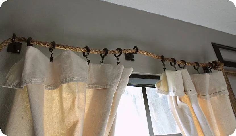 - Используя толстый канат. Для этого потребуется установить в стену над окном три крепления-кронштейна. Через них продеть канат. На него вешаются занавески на люверсах.