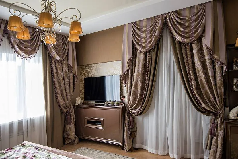 Расположение и размер комнаты. Роскошные шторки, дополненные кистями, густым, волнистым и прозрачным тюлем, тонким ламбрекеном – отличный вариант для просторной спальни. Для небольшого помещения стоит ограничить окно гардиной или воздушным тюлем.