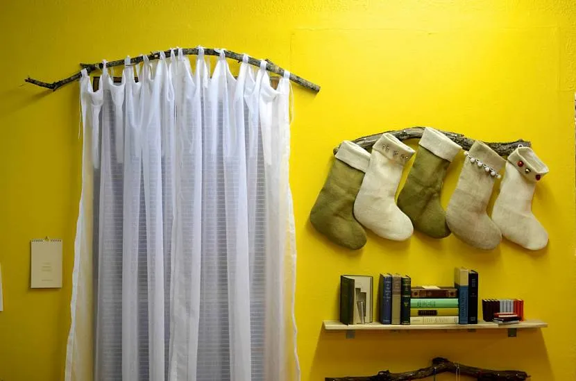 Отличная идея – укрепить на кронштейнах живые ветки деревьев. В этом случае петли будут держать занавески на импровизированном карнизе, что дополнительно подчеркнет простоту и уют домашнего пространства.