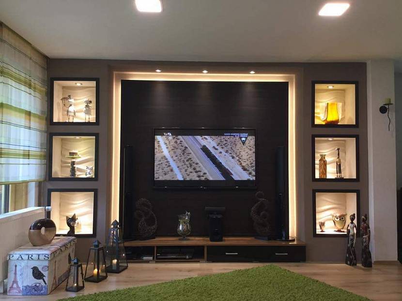 Ниша под телевизор из гипсокартона в гостиной комнате должна занимать наиболее удобное, для просмотра членами семьи и их гостями любимых передач, расположение. Рекомендуется размещать телевизионную технику на высоте 1 м. от пола, данный показатель можно рассчитать самостоятельно, учитывая средний рост членов семьи.