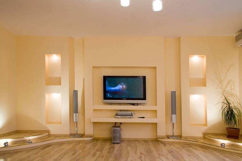 Для больших ЖК-телевизоров предусматриваются арка или ниша. Также можно «забуриться» через лист гипсокартона в бетонную или кирпичную стенку, используя большие дюбеля.