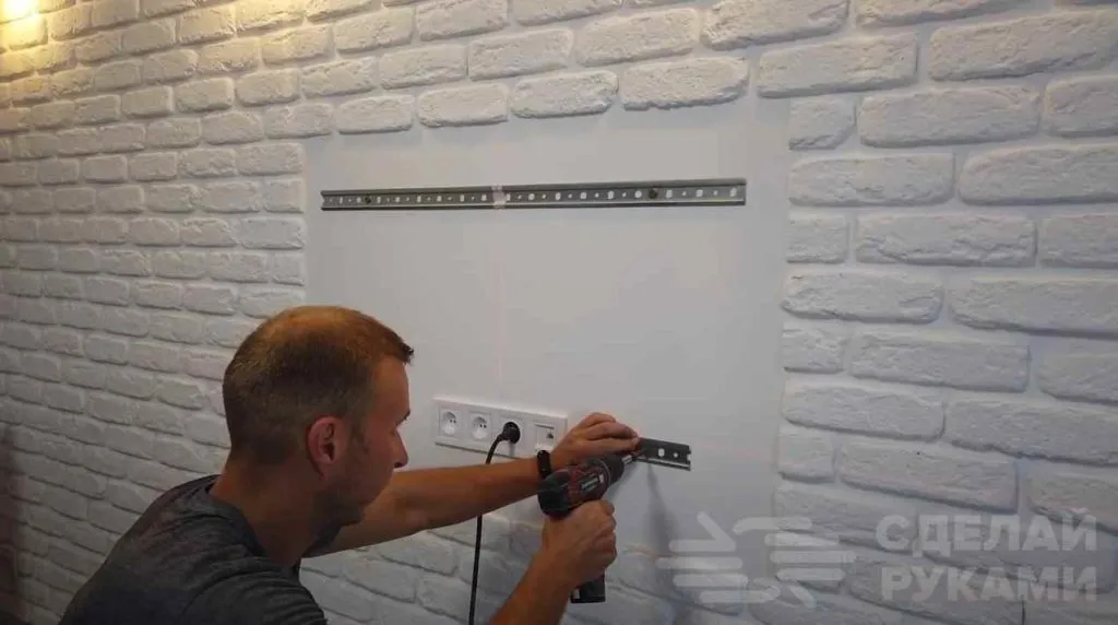 Предварительно измерьте расстояние между будущими дырками, чтобы детали можно было прикрепить друг к другу.Прикрутите саморезами «шину» к бруску.После этого привинтите брусок с «шиной» к стене.Вначале отметьте, где будут располагаться дырки. Используйте строительный уровень, чтобы поставить каркас ровно.Просверлите отверстия в стене и вбейте в них дюбели.Просверлите дырки в бруске.Привинтите брусок к стене, вкрутив саморезы в дюбели. Используйте шуруповёрт.