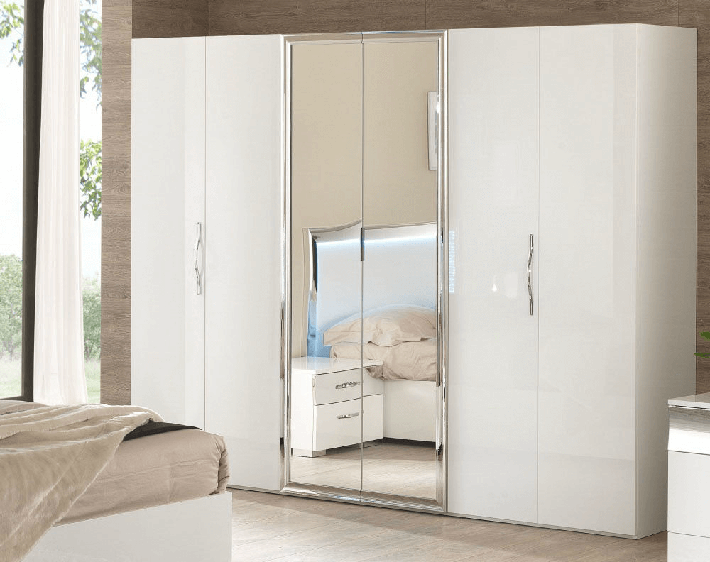 Дверцы с распашным или раздвижным механизмом преобразят интерьер и сделают его индивидуальным. Фасады могут быть оформлены с помощью нескольких оттенков белого. А также используются стеклянные или зеркальные вставки, придающие шкафам оригинальности. Роскошные модели часто дополняются кожей.