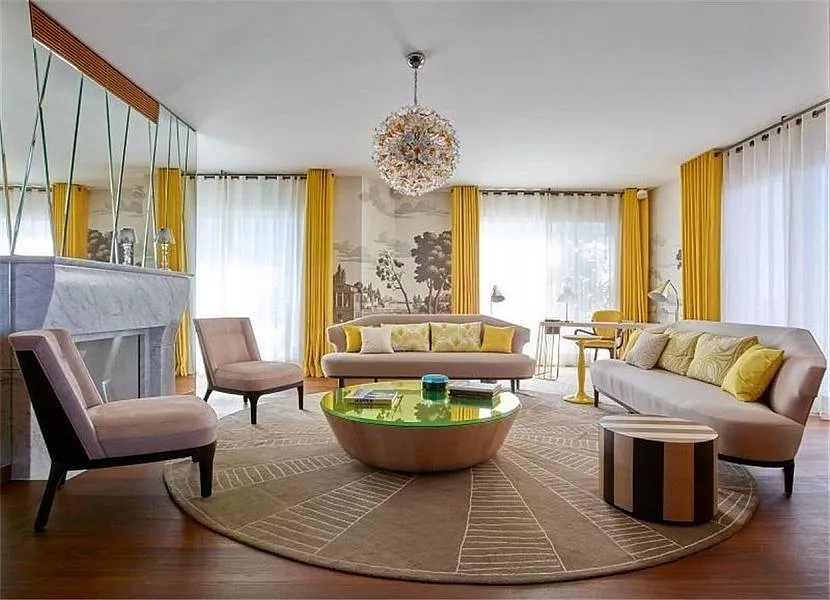 Центром кругового расположения выступает потолочный светильник, стол или ковер. От фокусной точки мебель ставят по кругу. Метод используют при наличии полуовальных стен и для крупных комнат. В размещении придерживаются баланса, учитывают особенности декора или размер компонентов.