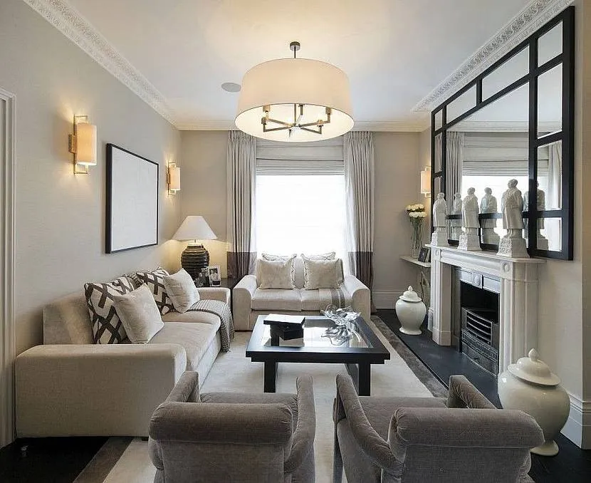 Правильно выбранный декор органично дополнит общий интерьер узкой и длинной гостиной. Здесь не обойтись без разных типов зеркал, способных визуально расширять границы внутреннего пространства. Не менее удачным декором для узких и вытянутых в длину гостиных станут: