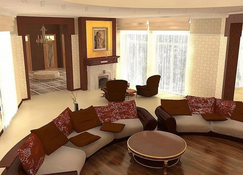 Нестандартная гостиная – это многоугольная, круглая, трапециевидная или полукруглая комната, в которую нелегко вписать мебель классическим методом расстановки по линиям.